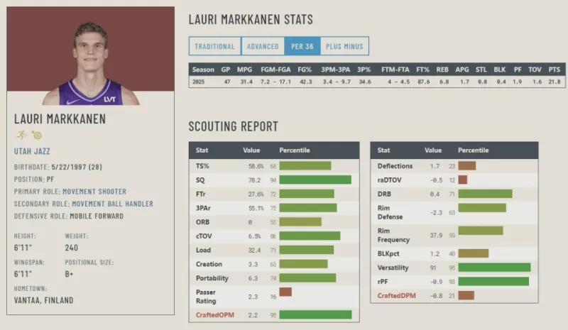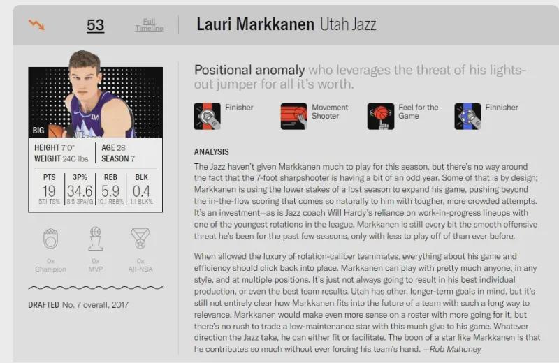 若拥有更具实力的队友支持时,他的比赛效率理应会重回正轨,马尔卡宁几乎可以与任何类型球员搭档,适配任何比赛风格,还能胜任多个位置。只不过,这种兼容性未必总能转化为个人最佳表现,甚至未必能为球队带来最佳战绩。犹他爵士队有着更长远的计划,但马尔卡宁在其未来蓝图中究竟扮演何种角色仍不确定。